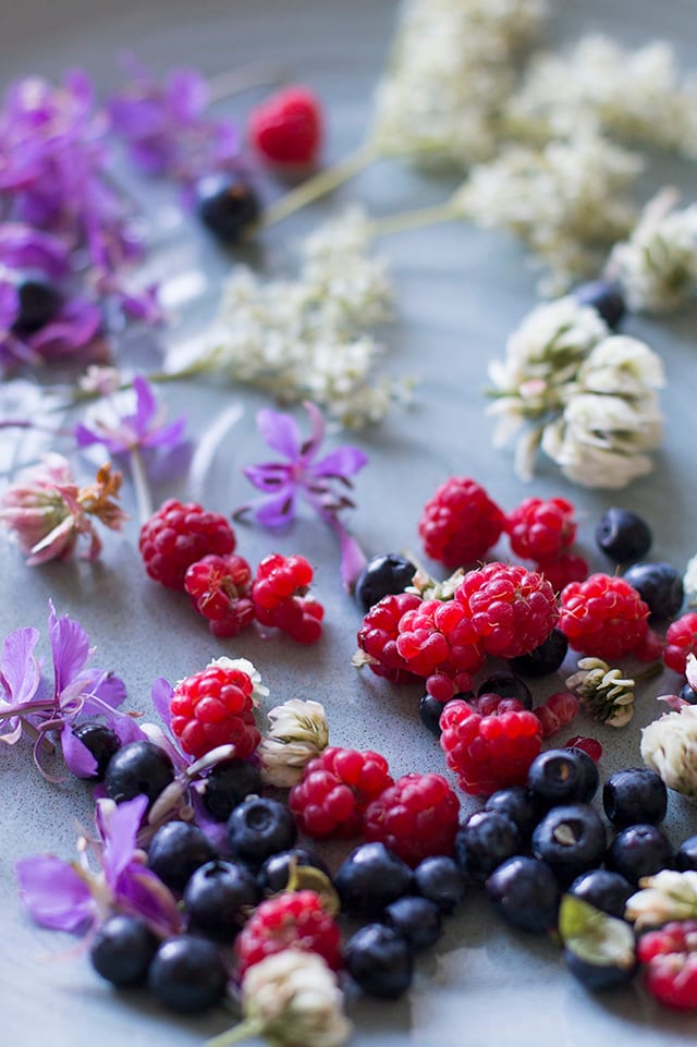 Käytin kukkia ja marjoja myös raakasuklaan ja mustikkapiirakan koristelussa. Maut ja värit sopivat oikein hyvin niihinkin.