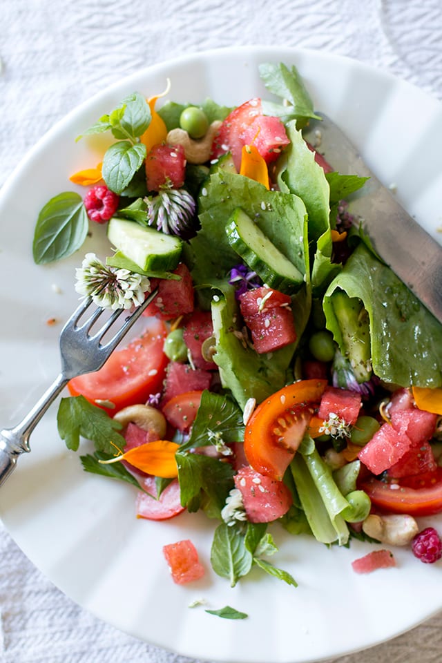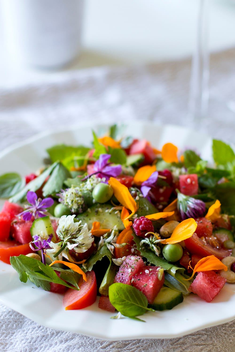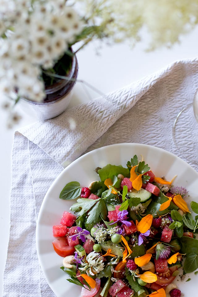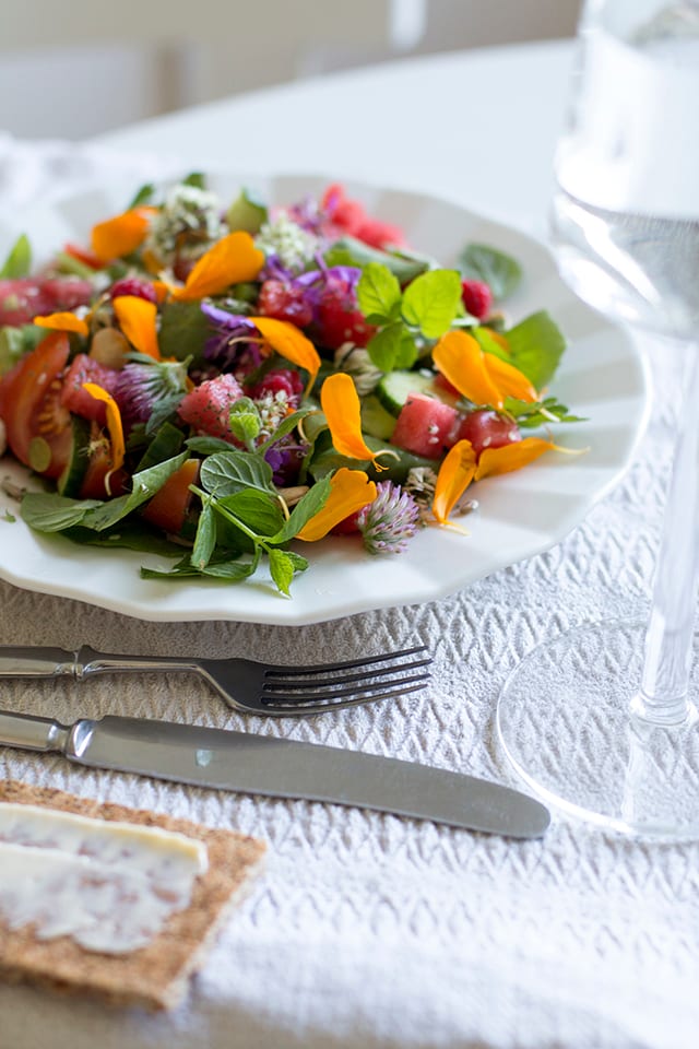 Arkinen salaatti muuntuu käden käänteessä kauniiksi ja juhlavaksi, kun päälle ripottelee luonnosta ja kukkapenkistä kerättyjä kukkia. En ollut itsekään kaikkia annokseen laittamiani kukkia aiemmin maistanut, ja yllätyksekseni ne toivat salaattiin todella hyvää makua. Tätä aion tarjota vieraillekin!