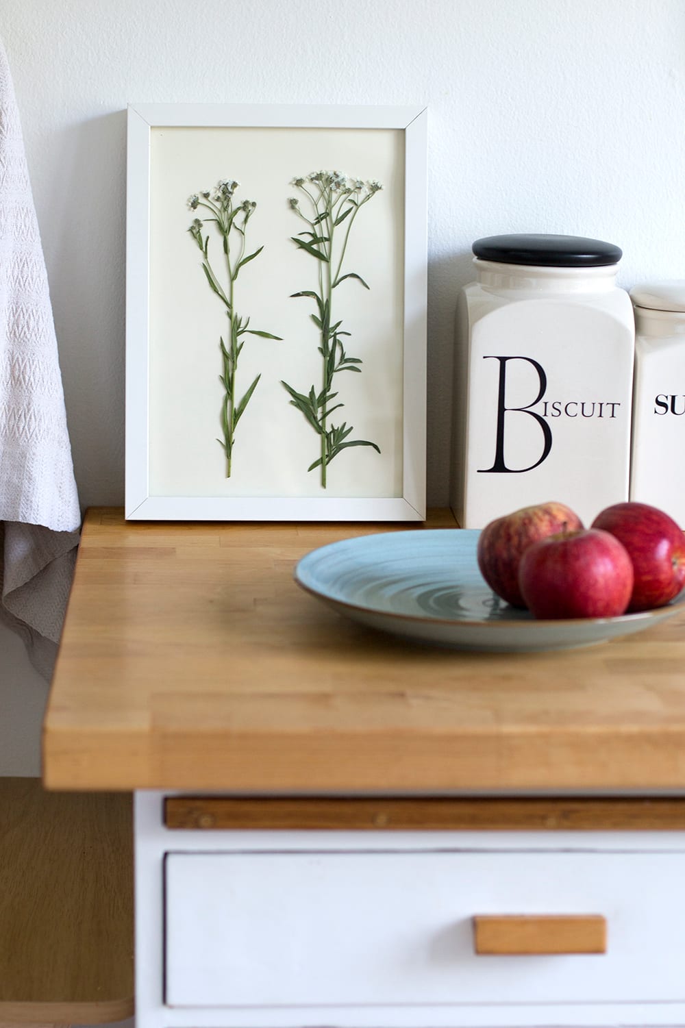 Kukkien kanssa puuhastellessa tulin laittaneeksi muutaman varren painon alle kuivumaan ja asettelin ne myöhemmin kehykseen keittiön sisustuksen piristykseksi.