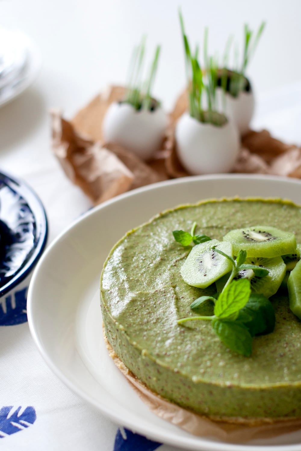 Kaada täyte pohjan päälle ja laita jähmettymään pakkaseen tai jääkaappiin. Koristele kiivillä ja mintun lehdillä ennen tarjoilua.