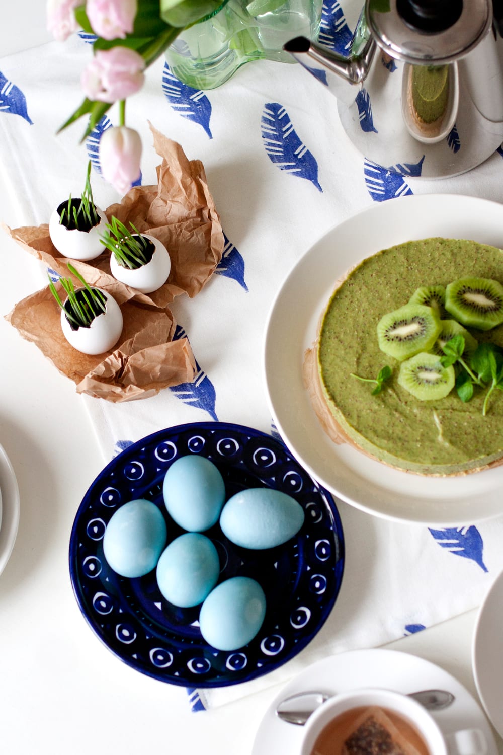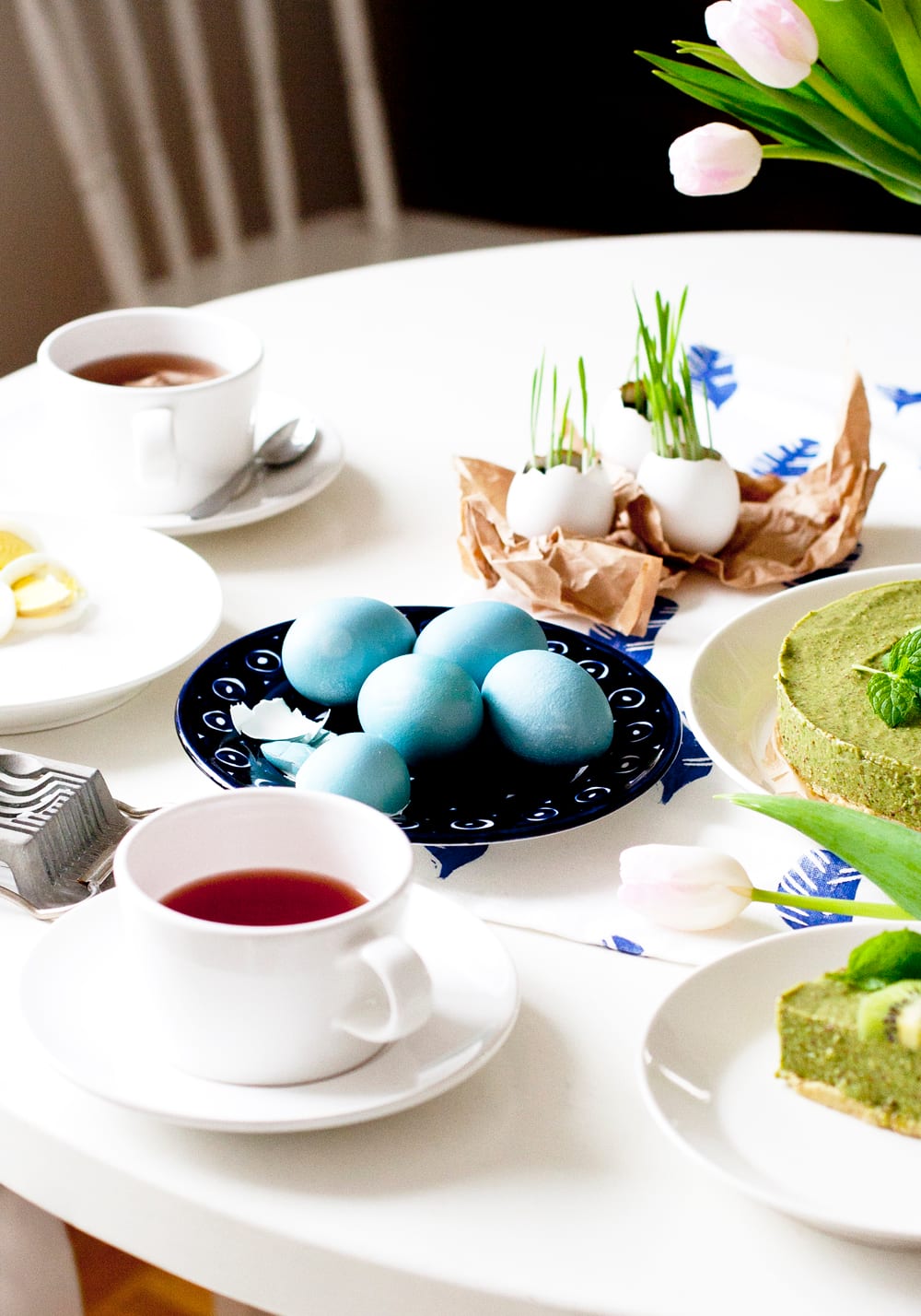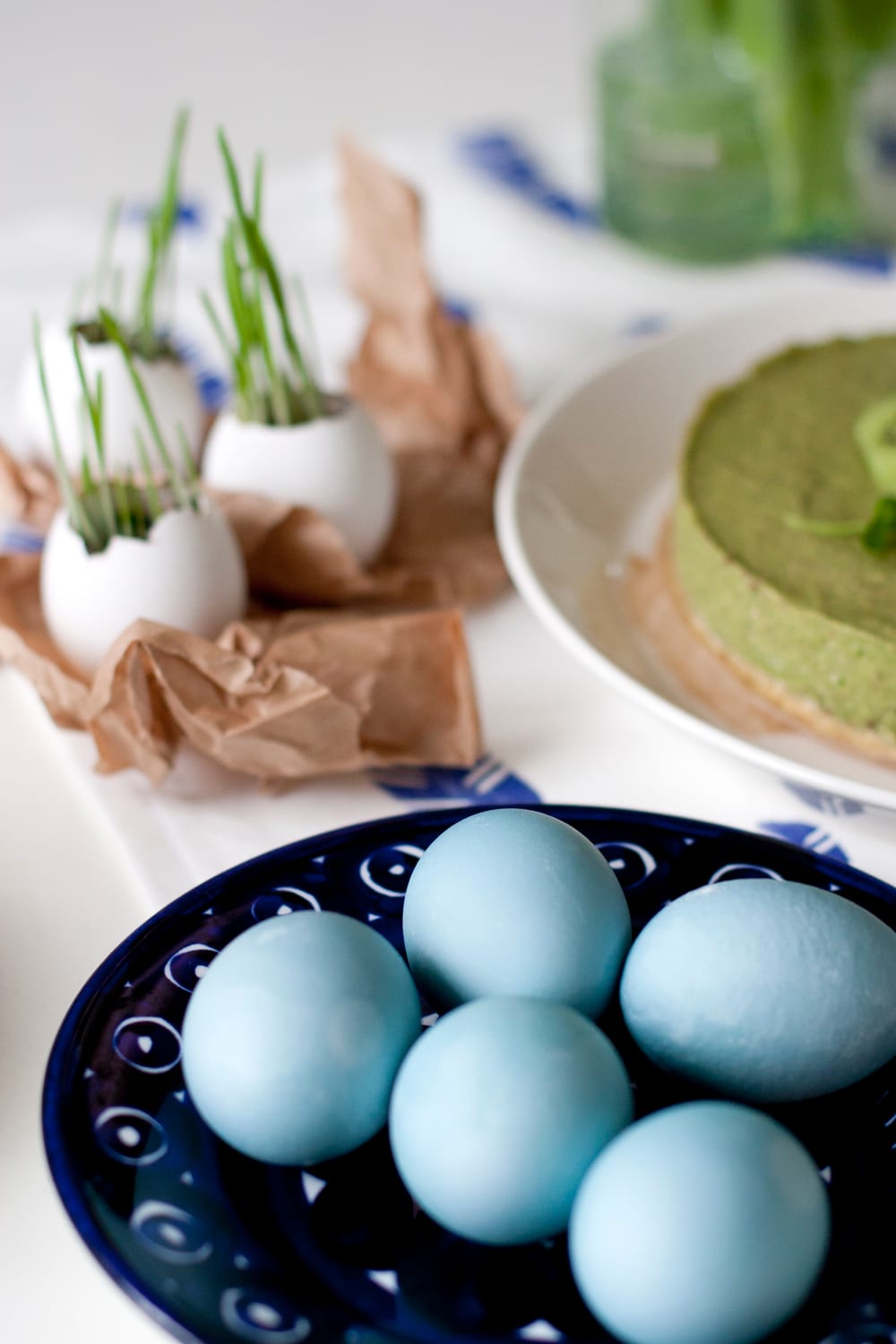 Upean sävyiset siniset pääsiäismunat värjäytyvät punakaalilla: pilko kaalia pari, kolme desiä keitinveden sekaan. Keitä munia kymmenen minuuttia ja ota kattila liedeltä. Sekoita liemeen pari teelusikallista suolaa ja loraus valkoviinietikkaa. Siirrä jääkaappiin värjäytymään muutamaksi tunniksi tai seuraavaan päivään. Väriliemi on punaviolettia, mutta munat värjäytyvät, ihme ja kumma, sinisiksi.
