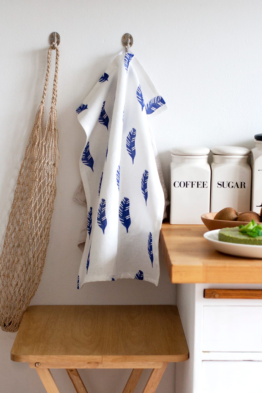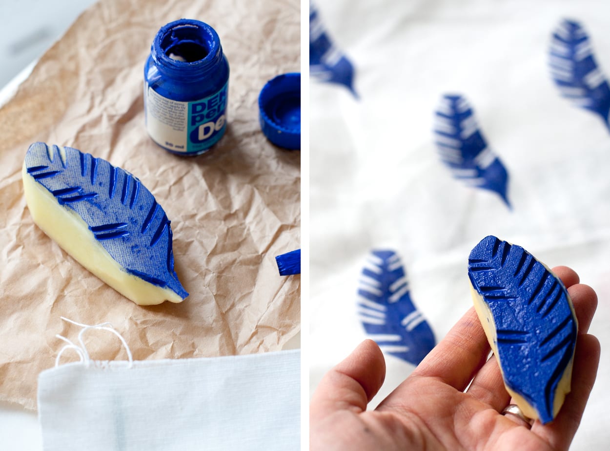 Keittiöpyyhkeen sulkakuvion painamiseen käytin perunaleimasinta. Yksityiskohtaisen kuvion kaivertamiseen tarvitaan linokaiverrin, mutta yksinkertaisia leimasimia voi leikata perunasta terävällä veitsellä tai esimerkiksi piparkakkumuotilla. Väri levittyy helpoiten lattasiveltimellä. Painamisen jälkeen värin annetaan kuivua, minkä jälkeen se kiinnitetään pesunkestäväksi silittämällä nurjalta puolelta kankaan kestämällä maksimilämpötilalla. Tässä voi käyttää valmiita yksivärisiä keittiöpyyhkeitä tai ommella itse. Kankaanpainovärejä myydään askartelutarvikeliikkeissä.