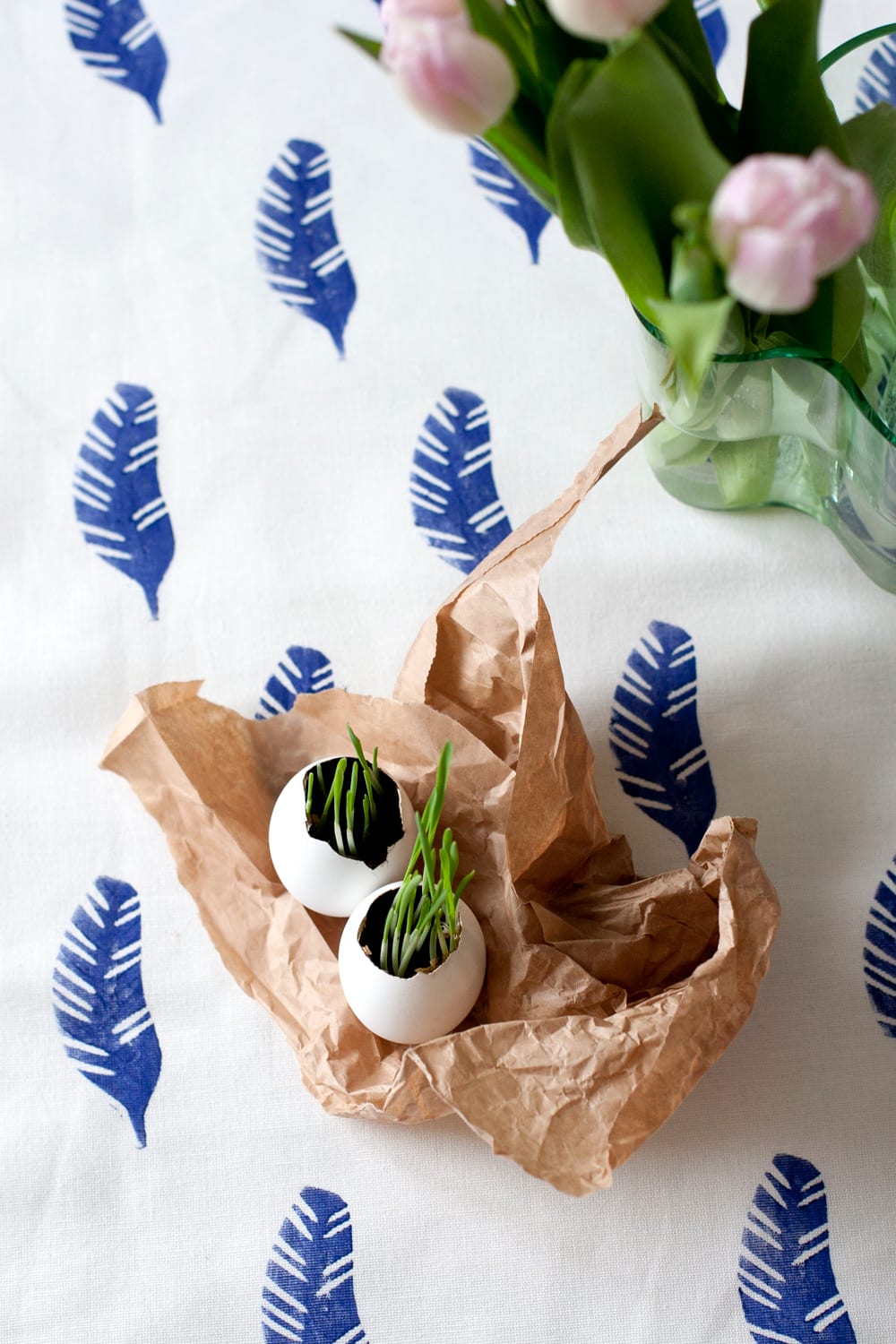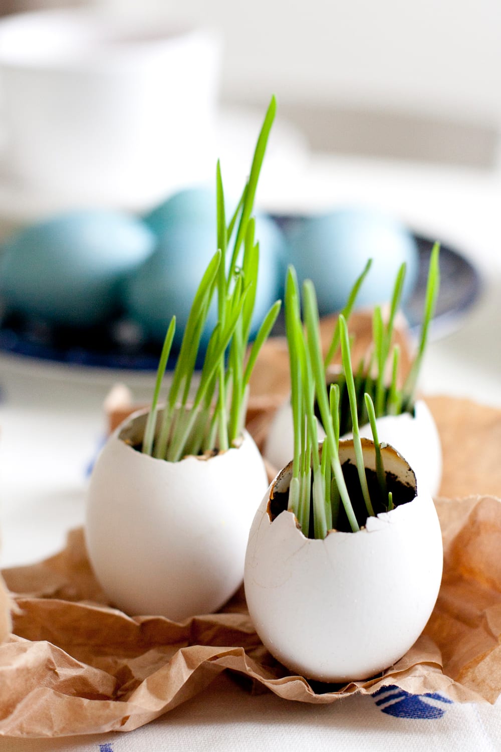 Suloiset pääsiäisruohot voi kasvattaa oikeissa munankuorissa. Riko munat varovaisesti niin, että ehjäksi jää enemmän kuin puolet kuoresta. Täytä mullalla, kastele hieman ja kylvä siemenet. Munakennossa kylvökset pysyvät pystyssä. Voit peittää kelmulla itämisen jouduttamiseksi.