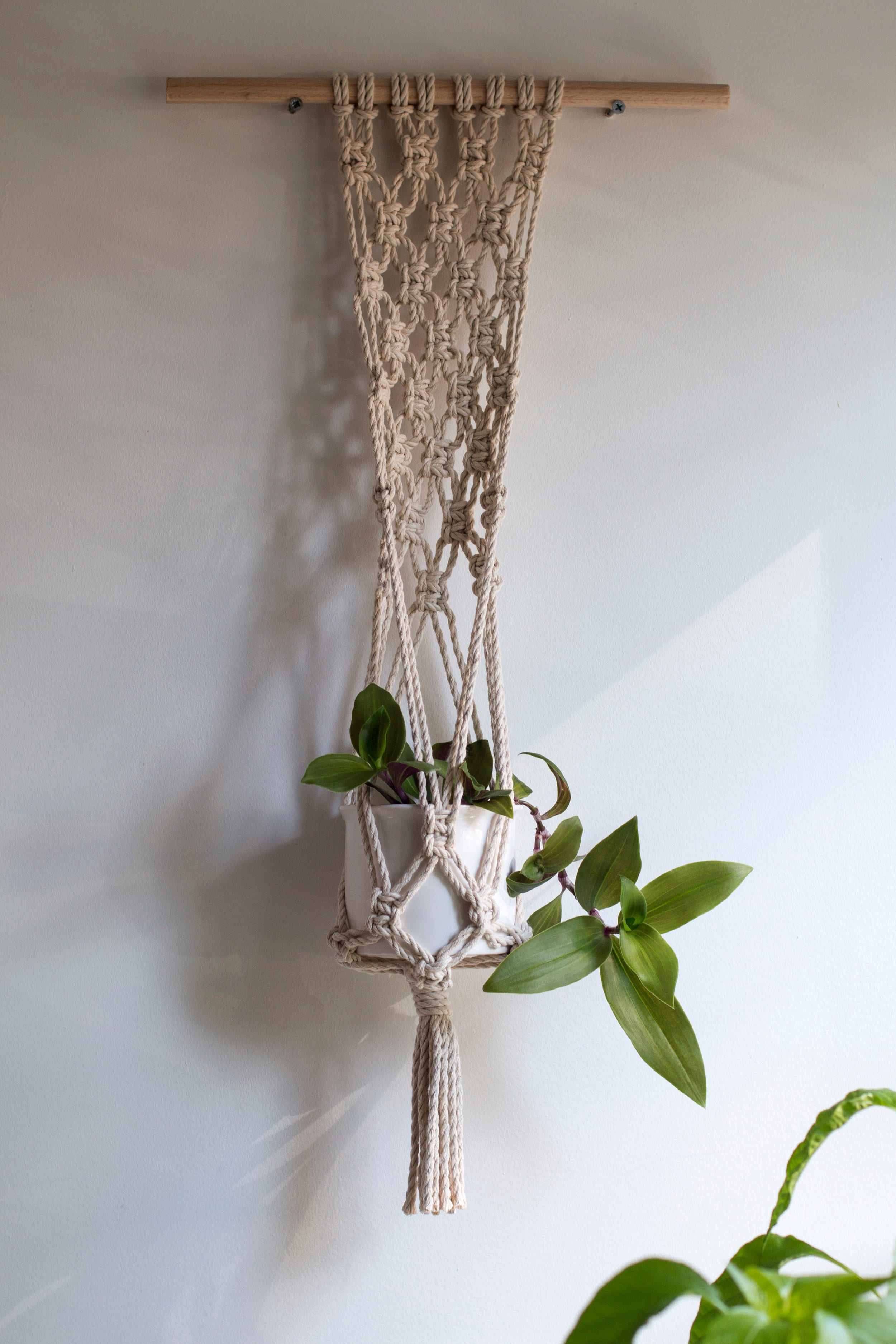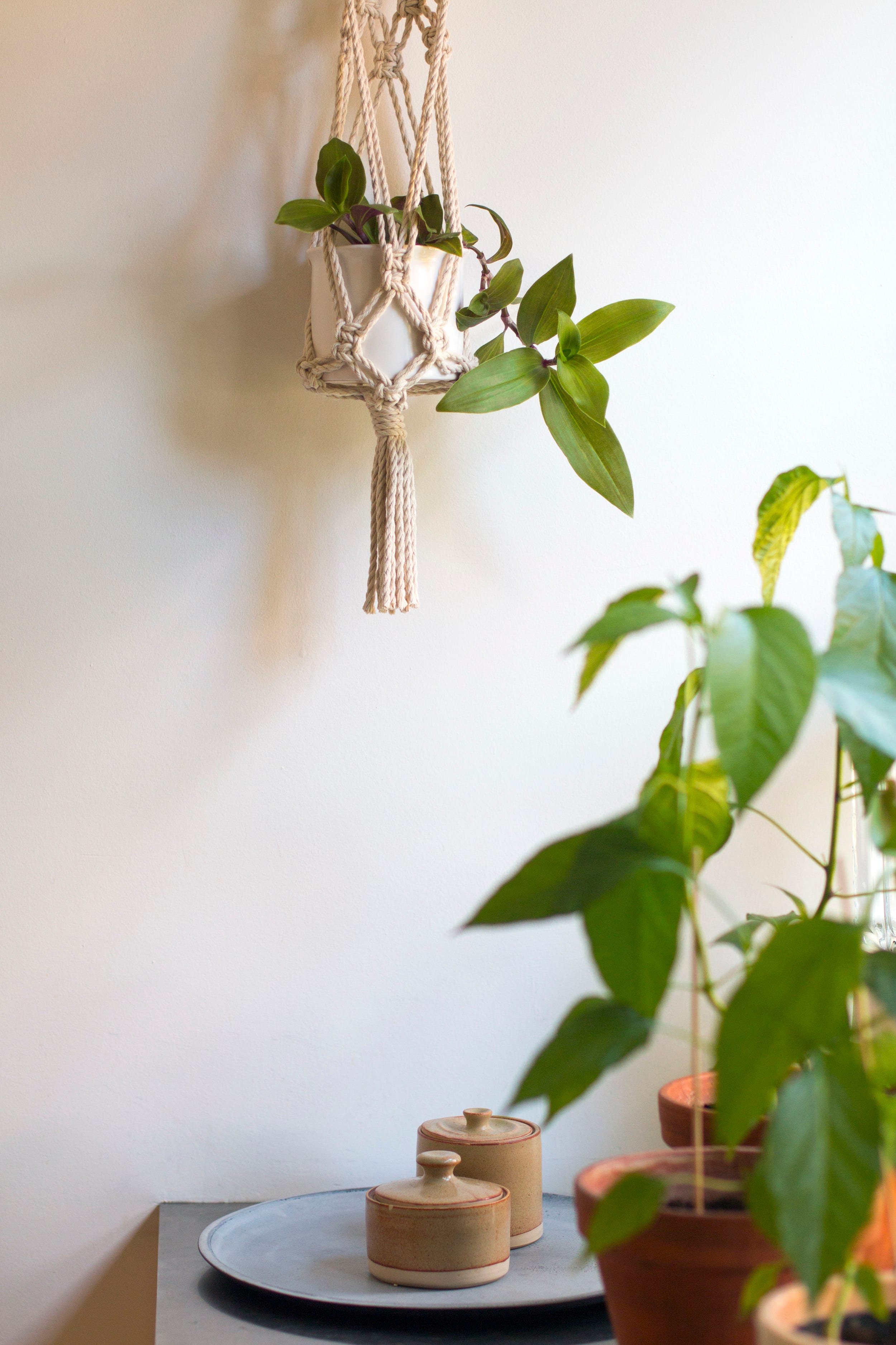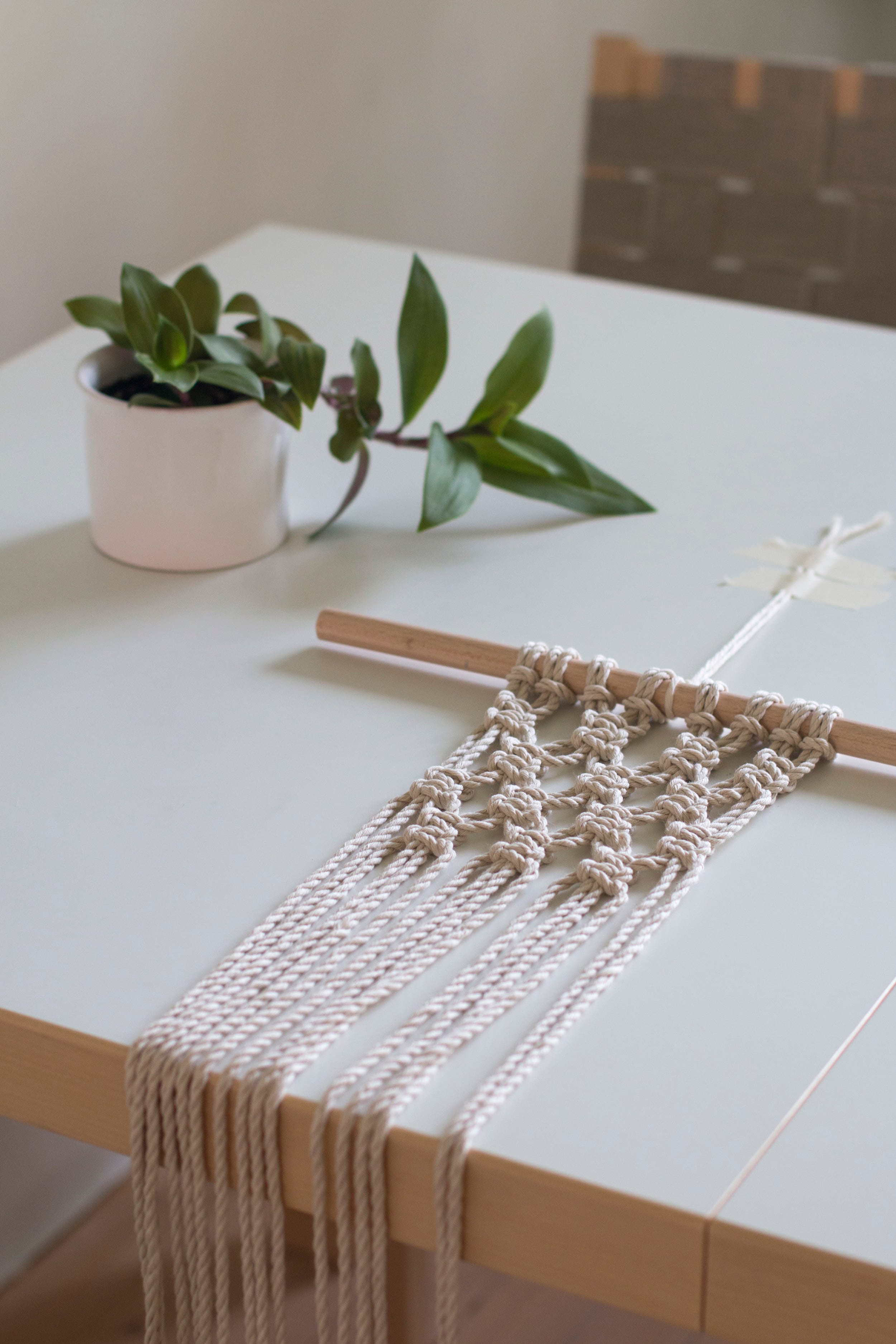 Sisustamistakin on tullut hieman harrastettua, sillä muutimme alkuvuodesta. Keittiön seinällä oli tyhjä paikka aamuauringossa, joten solmin siihen seinäamppelin makrameetekniikalla. Amppeleihin löytyy netistä valmiita ja ilmaisia ohjeita pilvin pimein, ja solmiminen on oikeasti tosi helppoa. Itse en löytänyt mieluisaa ohjetta, joten opettelin yhden solmun ja tein koko amppelin sitä käyttäen. Tarkoitus oli laittaa amppeliin jokin hyötykasvi, kuten yrtti, jotta siitä on iloa erityisesti keittiössä. Ystävältä saamani juorun alku sopi siihen noin pienenä kuitenkin niin ihanasti, että antaa sen kasvaa siinä nyt jonkin aikaa.