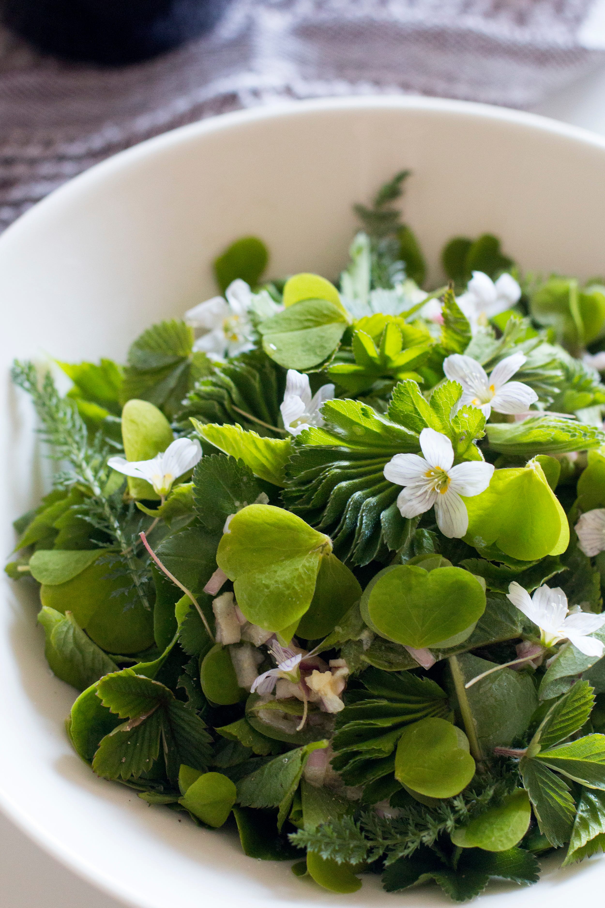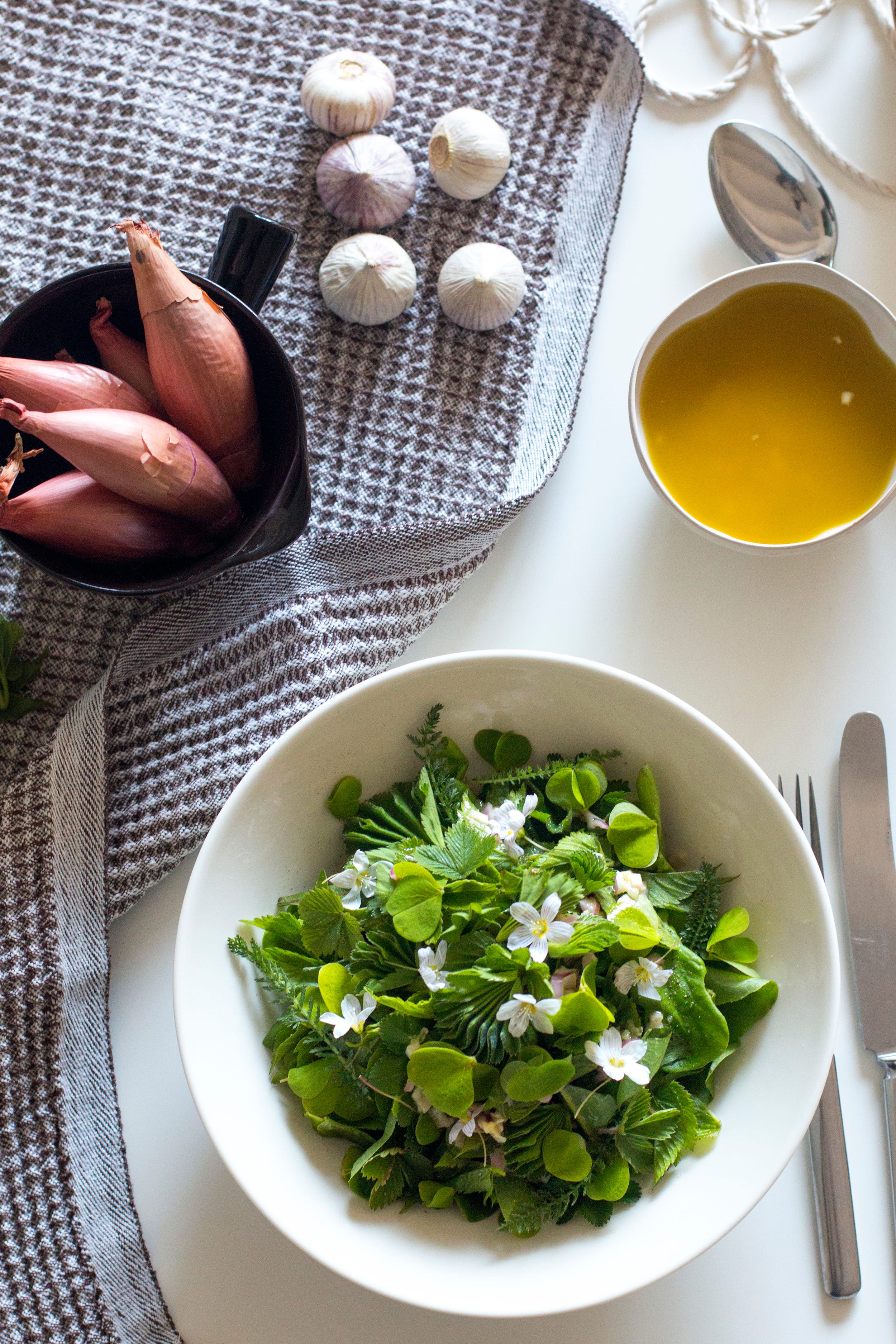 Salaatin voi valmistaa ihan kokonaan villivihanneksista, tai jos se epäilyttää, käytä erilaisia kaupan salaatinlehtiä ja mausta annos tuntemillasi villiyrteillä. Kerää vain kasveja, jotka takuulla tunnistat syötäviksi!