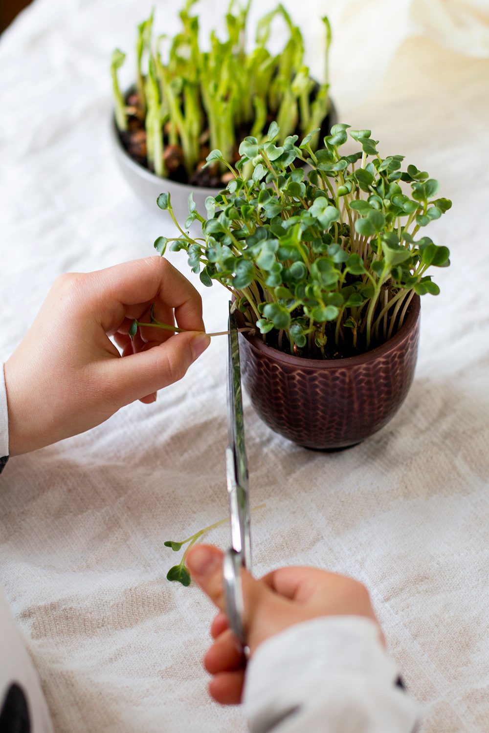 Meillä kasvoivat: härkäpapu, retiisi, voileipäkrassi ja lehtikaali. Lisäksi kylvin mangoldia, mutta se kasvoi hieman hitaammin, ja versot olivat aika hentoja. Myös herne on helppo ja nopea kasvatettava. Itämisen nopeuttamiseksi voi kuivattuja herneitä ja papuja liottaa vedessä muutaman tunnin ennen kylvämistä. Kylvöohjeita löytyy myös siemenpusseista. Kylvökset pidetään tasaisesti kosteina sumuttelemalla päivittäin suihkupullolla. Multana käytin kylvömultaa.