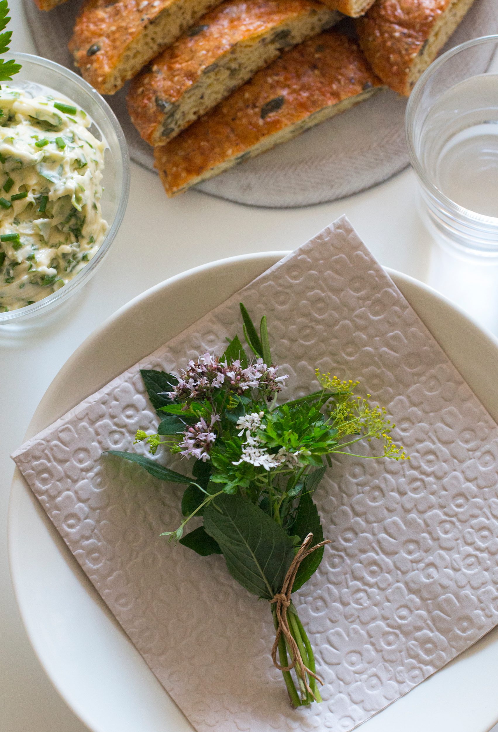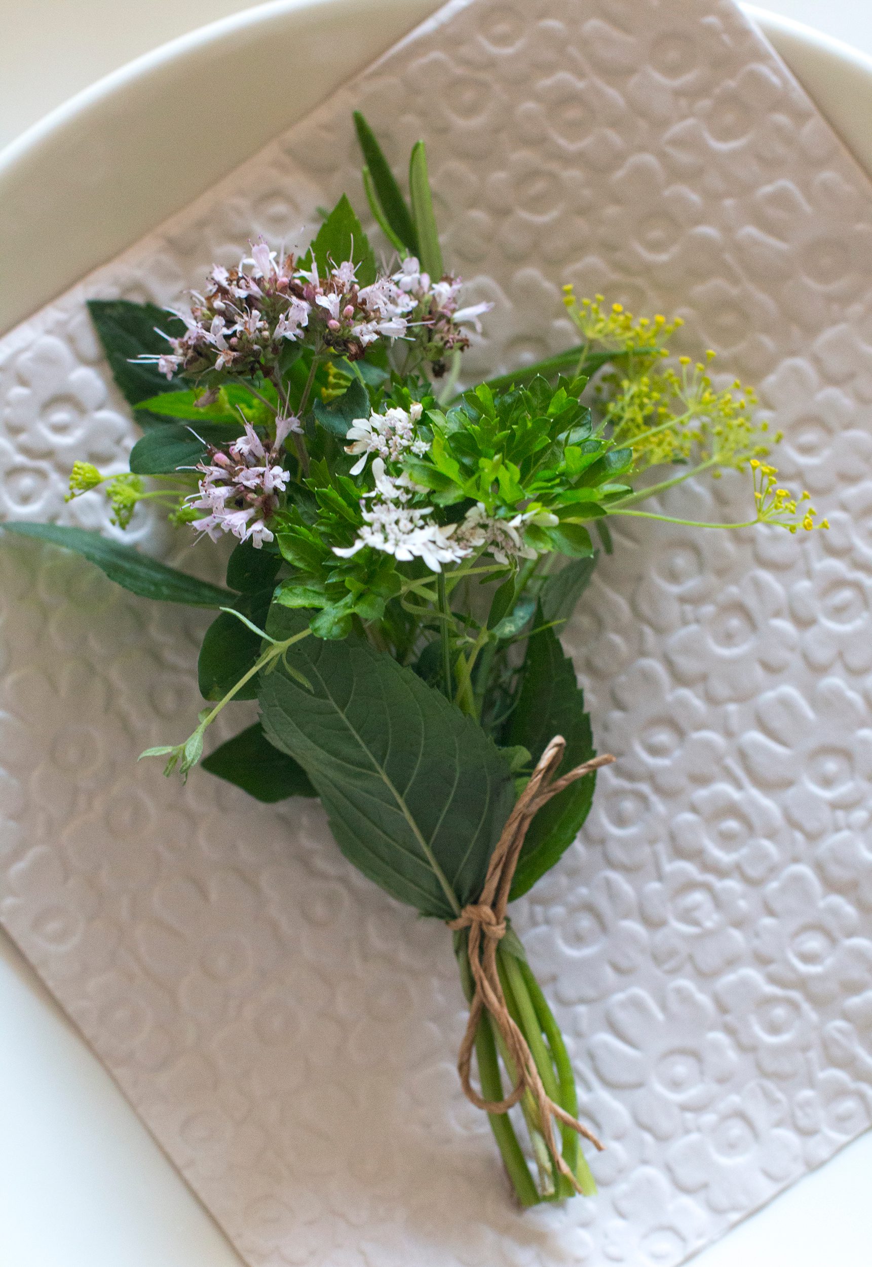 Keräsin viljelyksiltäni muutamia yrttejä ja sidoin ne suloisiksi minikimpuiksi. Kimput ovat ihana tuoksuva koriste, ja myös hauska puheenaihe ruokapöytäkeskusteluun. Tunnistatko kaikki yrtit? Miltä ne tuoksuvat ja maistuvat? Niillä voi ruokailija tietysti myös maustaa oman annoksensa makunsa mukaan. Pienet kimput voi lopuksi ripustaa keittiön seinälle kuivumaan.