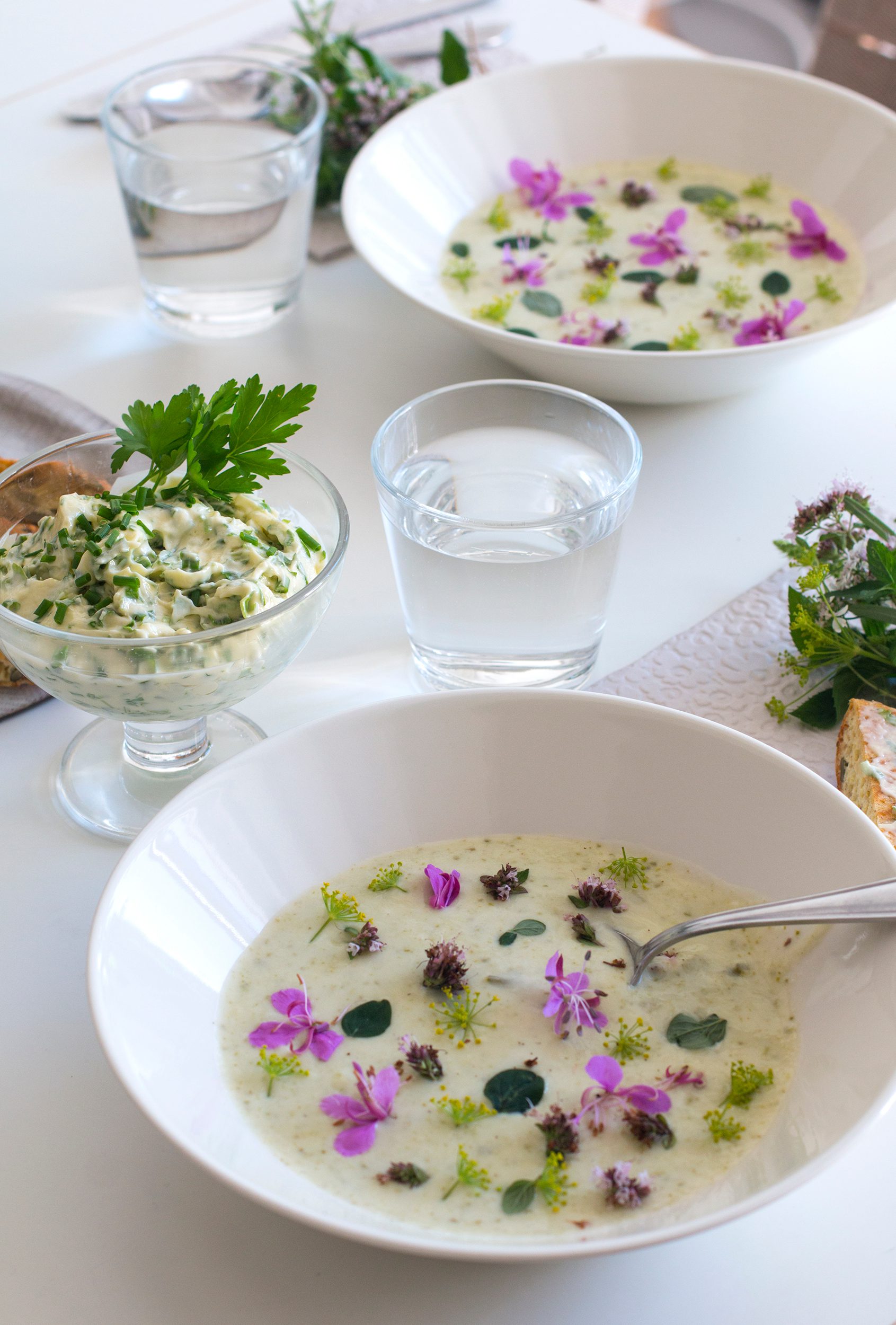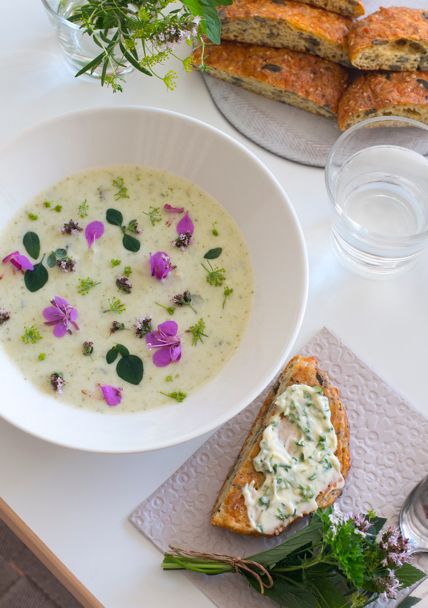 Koristeet kukkakaalikeittoannoksiin ovat simppelit, vaikkakin mielestäni hyvin kauniit: horsman ja tillin kukkia sekä oreganon lehtiä ja kukkia.