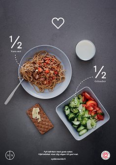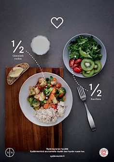 - Lautasmallissa vähintään puolet lautasesta varataan kasviksille: tuoretta salaattia, raasteita, kypsennettyjä kasviksia - kaikki vihannekset ja juurekset, paitsi peruna ja bataatti lasketaan. Lorauta kasviksille lusikallinen öljykastiketta. Toinen puolikas lautasesta jää lämpimälle ruualle, vaikkapa makaronilaatikolle.