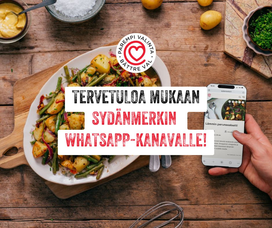 Sydänmerkin WhatsApp-kanavalta saat 1–3 kertaa viikossa resepti-ideoita, jotka sopivat niin kiireiseen arkeen kuin viikonlopun rentoihin kokkailuhetkiin. Mukana on tuttuja makuja ja uusia oivalluksia – kaiken tasoisille kotikokeille.